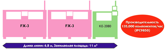 Ниже приведен пример линейки, состоящей из двух автоматов FX-3 и одного KE-2080, с общей производительностью 135 000 компонентов/час в соответствии со стандартом IPC9850. При этом длина линейки составляет 6,8 м, а площадь занимаемой территории - 11 м².