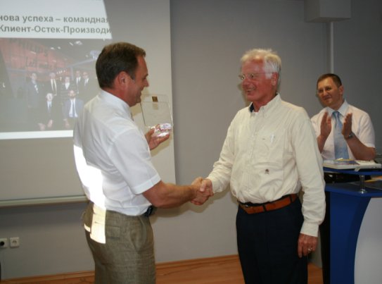 Господин Тон ван Райн выступил перед сотрудниками Предприятия Остек, рассказав о том, что в его глазах в 1996 году выделило Предприятие Остек и явилось причиной предложения сотрудничества от Philips EMT, он поделился принципами, которыми он руководствовался в работе. «Нужно гордиться своей страной, нужно гордиться своей компанией, нужно уважать Клиента, быть честным, искренним и скромным», - вот секрет результативной и качественной работы, по мнению господина ван Райна.