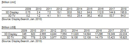Согласно изучающей рынок дисплеев компании DisplaySearch, сектор 3D вырастет с $902 млн в 2008 году до $22 млрд в 2018. Рынок 3D-ТВ достигнет $17 млрд, при этом объём поставок увеличится с 200 тыс. единиц в прошлом году до 64 млн в 2018 г.