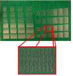 Трафаретная печать при эксперименте проводилась с использованием выполненного лазерной резкой трафарета из нержавеющей стали толщиной 0,005” (0,127 мм). Рис. 6 представляет собой фотографию апертур трафарета, предназначенного для нанесения пасты на КП типоразмера BEG.