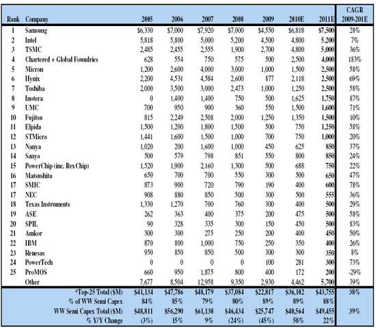Компании, выпускающие микросхемы, в ближайшие два года намерены существенно увеличить свои капиталовложения в материальные средства. Согласно анализу FBR Capital Markets капитальные затраты (CapEx) ведущих производителей чипов в 2010 году составят $40,6 млрд, что на 58% больше, чем в прошлом году. Данное положение ряд аналитиков рассматривает как большое достижение и переломный момент в производстве, особенно по сравнению с прошлогодним урезанием CapEx на 45%. В таблице приведен топ-25 компаний, лидирующих по этим вложениям.