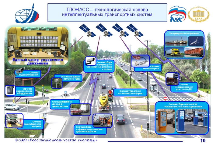 «Новые перспективы в развитии интеллектуальных транспортных систем открывает использование комплексов спутникового мониторинга (на базе технологий ГЛОНАСС). В них наиболее эффективно завязываются задачи интермодальных перевозок пассажиров и грузов, логистики, управления транспортными коридорами и движения в муниципальных образованиях, телематики и экономики».