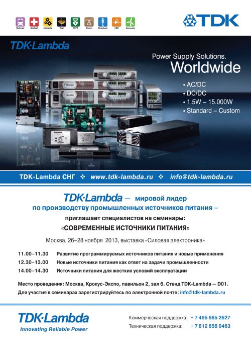 Корпорация TDK-Lambda приглашает специалистов на цикл семинаров «Современные источники питания» в рамках выставки «Силовая Электроника 2013».